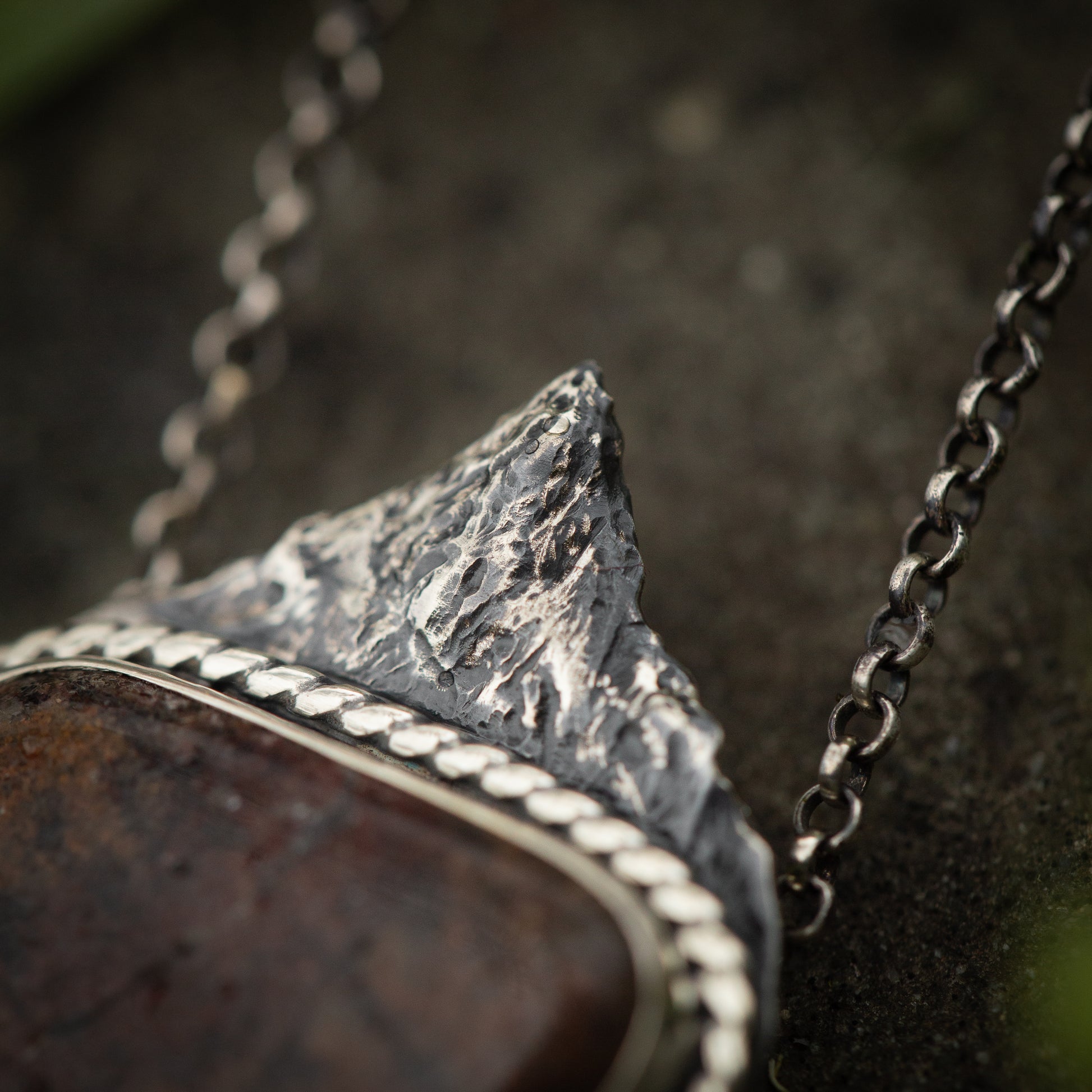 A richly detailed rugged mountain peak rises above the earthy beauty of this natural agate stone. Captured in sterling silver, the majesty of the natural world and its wonders shines through with this unique pendant.