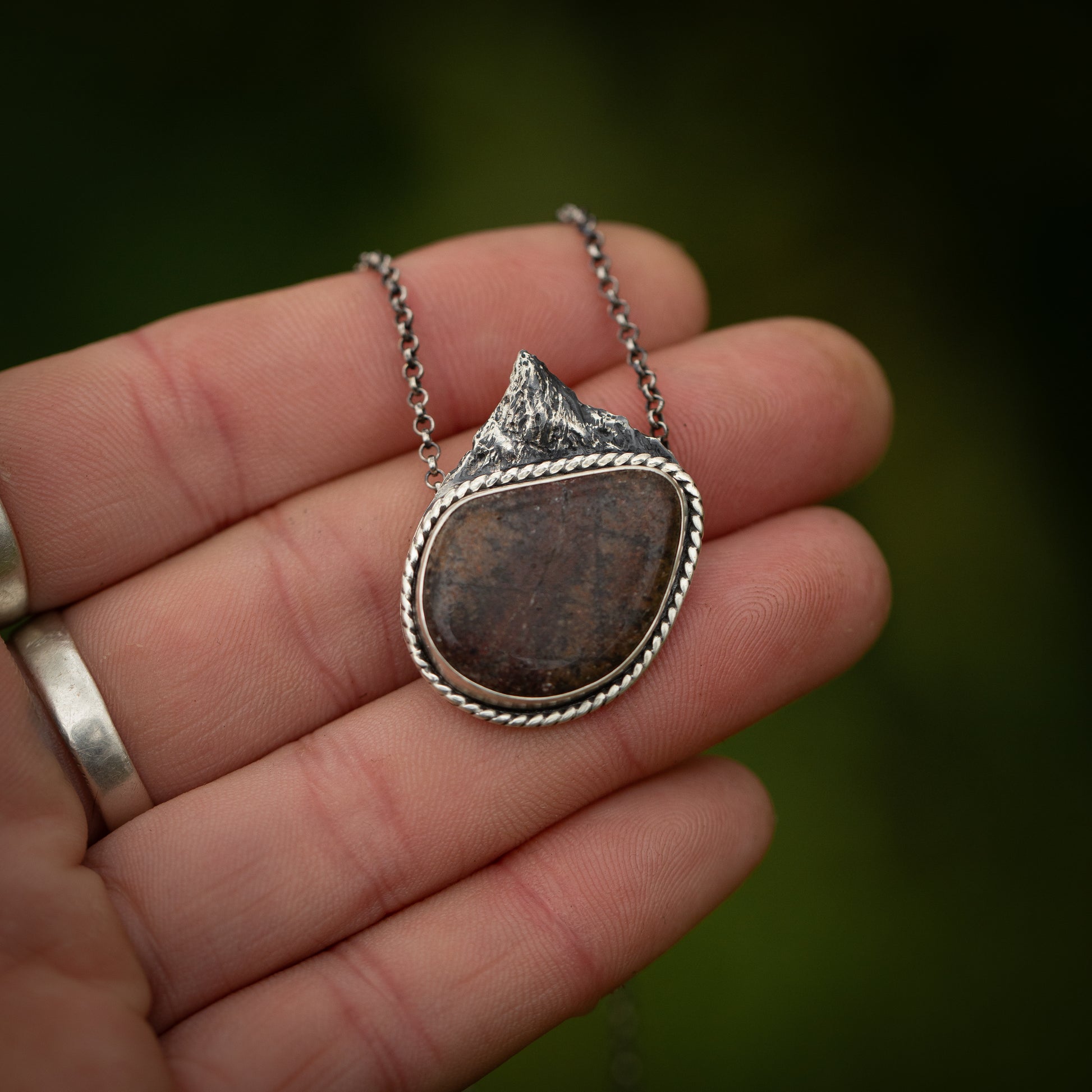 This mountain necklace is a part of the Nature's Legacy collection that draws inspiration from a remarkable assortment of free-form stones my cousin gifted me. Her father, my great uncle, had his friend cut these stones as a gift to her as she began to pursue metalsmithing in high-school. The stones in this collection create a link between the generations of artists and metalsmiths in my family who have honored nature in their work. I’m grateful to carry on this tradition and to work with these stones to keep alive the meaningful connections we each share with the natural world, our families, and our communities.