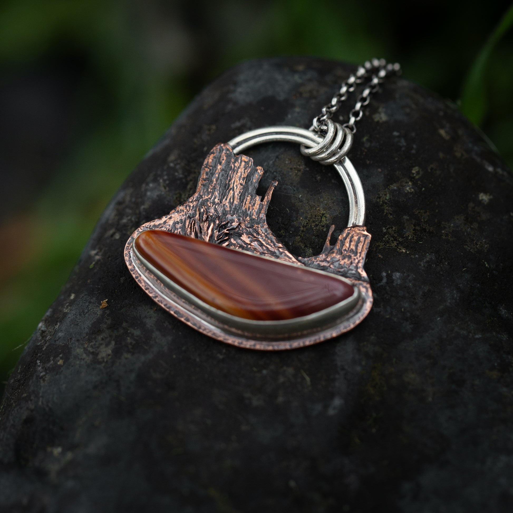 Let the majestic grandeur of the Valley Vista necklace transport you to Monument Valley's breathtaking desert landscapes. This copper and silver necklace captures the iconic sandstone formations. Paired with a stunning banded stone that echoes the valley's natural beauty, this necklace is for anyone whose heart runs most free in desert expanses.